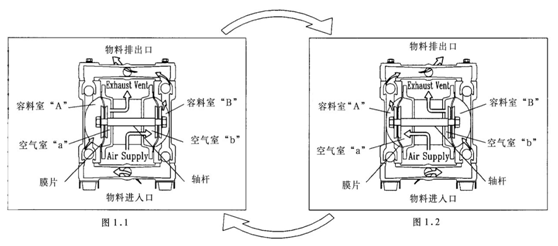 軸杆上(shàng)固定有(yǒu)兩個(g虣φ)膜片,每端一(yī)個(gè)。當壓縮空(kōng)氣供至空(kōng)氣↓≈α₩室b(右側,見(jiàn)圖1.1)時(shíγ♦),軸杆向右移動,容料室B中的(de)物(wù)料被擠出,同時(shí)被吸♣↓進容料室A中。